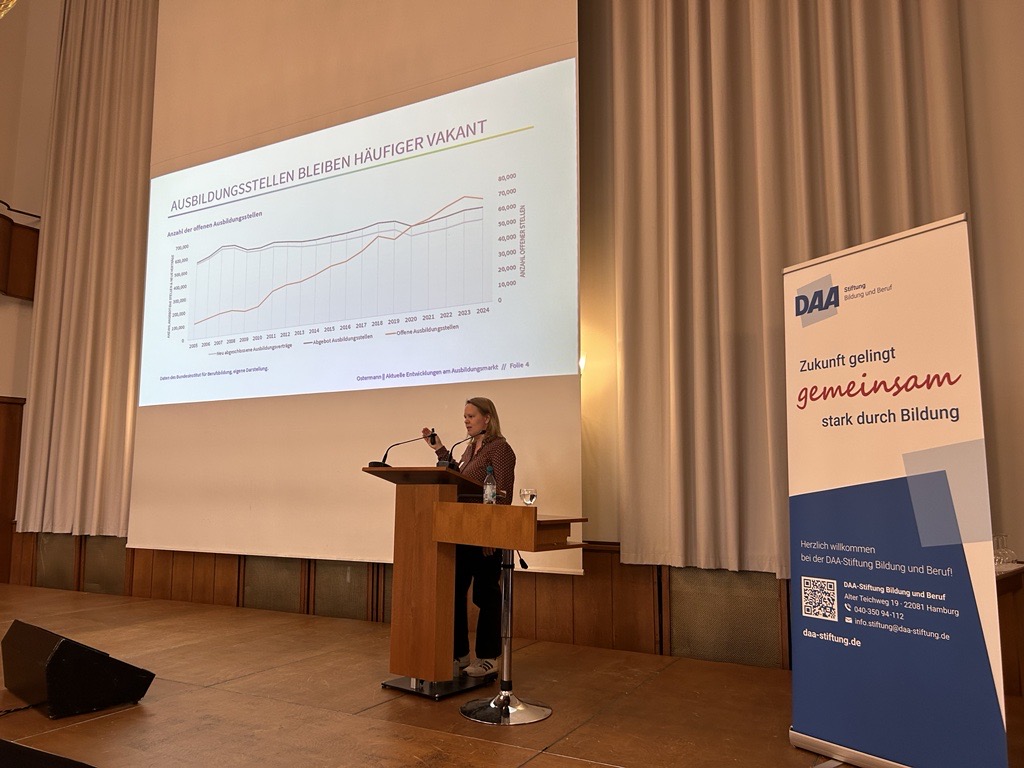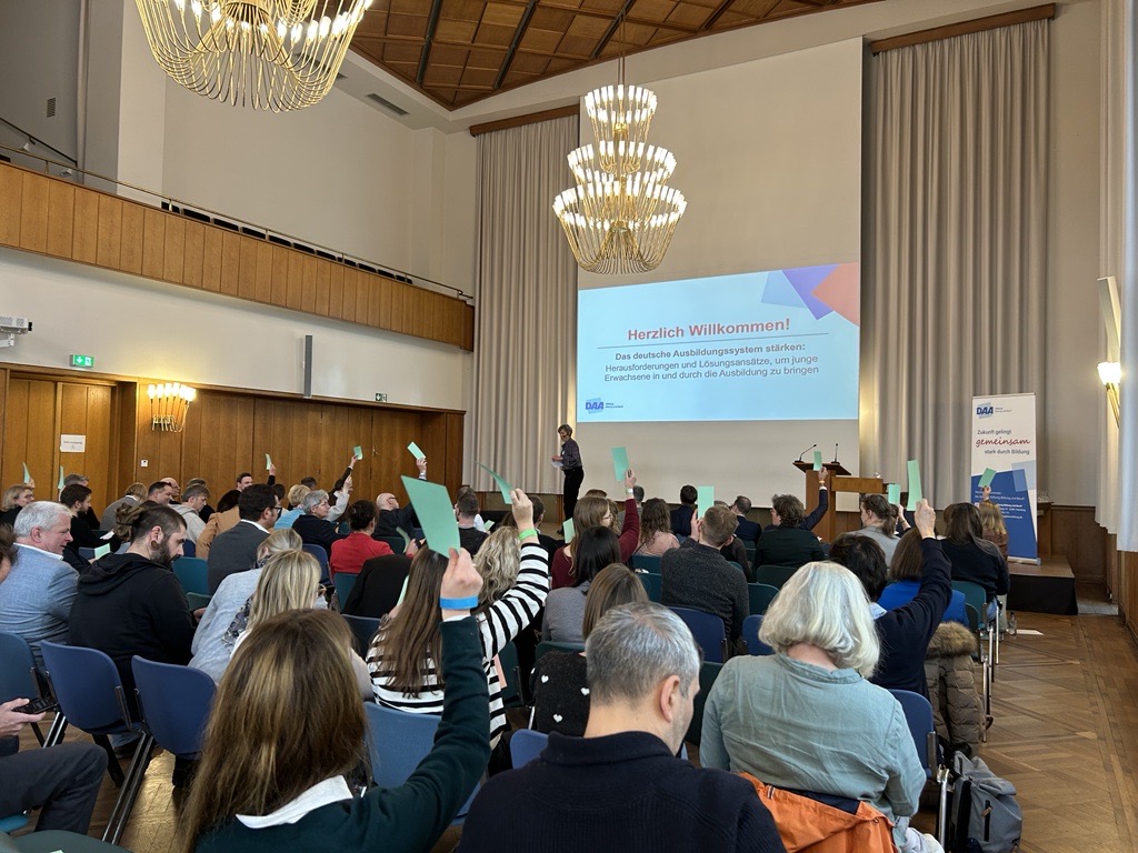 2,9 Millionen Menschen in Deutschland haben keinen Berufsabschluss – gleichzeitig bleiben zahlreiche Ausbildungsplätze unbesetzt. Dieser deutliche Missstand im deutschen Ausbildungssystem war Anlass für die Fachtagung der DAA-Stiftung am 18.11.2025 in der Patriotischen Gesellschaft in Hamburg. Vertreter*innen aus Politik, Verwaltung, Wirtschaft, Gewerkschaften, Wissenschaft und Bildungspraxis kamen zusammen, um Lösungswege zu diskutieren und neue Perspektiven einzubringen.
